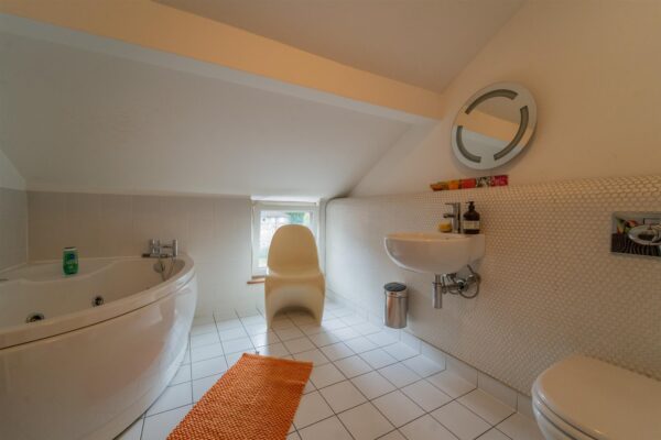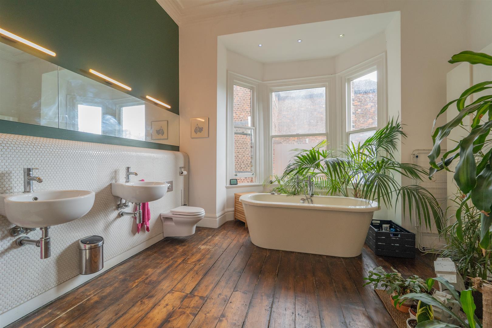 To the first floor, there are two generously sized double bedrooms, including a master with a bay window to the front, along with an additional third bedroom and a luxurious five-piece family bathroom featuring twin wash basins and a roll-top bath.