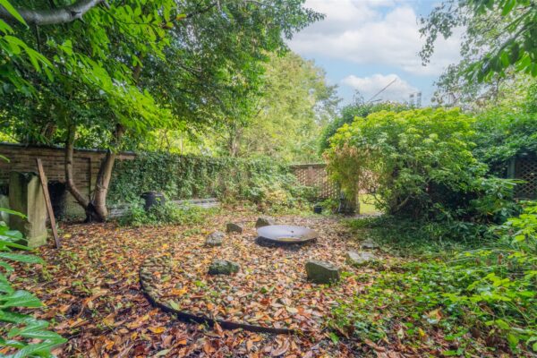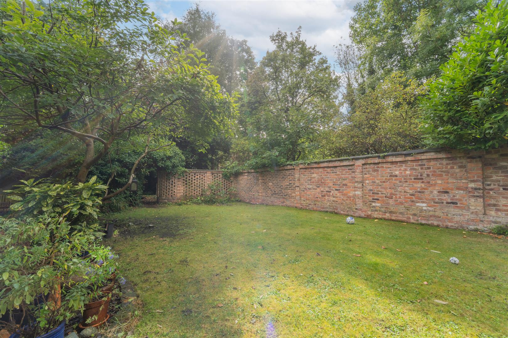 At the front, the property is bordered by a low-level brick wall shared with neighbouring homes. The garden features well-stocked flower beds filled with a variety of shrubs and mature trees. A gravel driveway leads to the front entrance and continues along the side of the house, offering generous off-road parking for several vehicles. To the rear, there is a sizable enclosed lawned garden, framed by a boundary wall and established hedgerow providing privacy from adjoining properties. The garden is complemented by mature trees, shrubs, and well-planted flower beds. From here, there is also access to the useful chamber cellars.