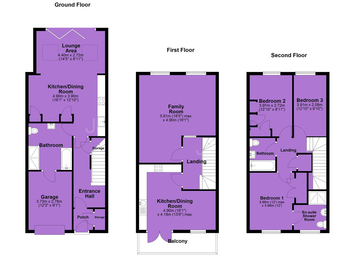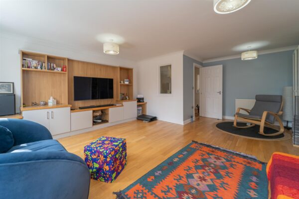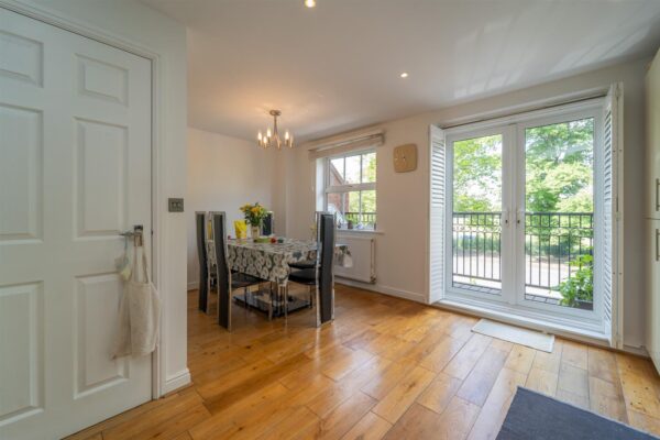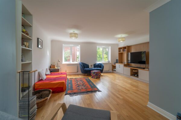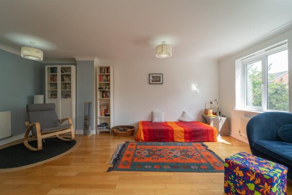 To the first floor there is a landing leading to a spacious family room with views over the rear garden, a kitchen/ dining rooms sits to the front aspect benefitting from a balcony.